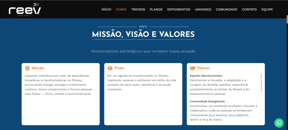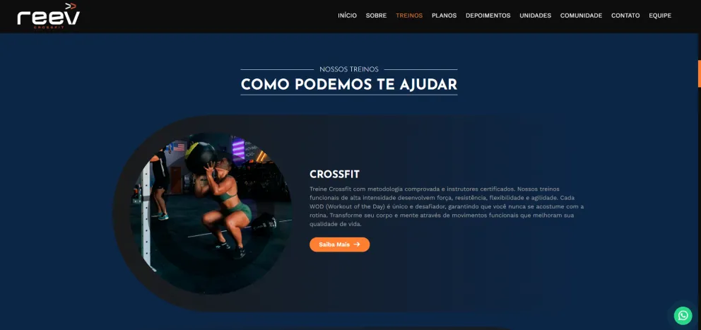 Reev Crossfit é uma academia/box de Crossfit que tem como foco treinos funcionais de alta intensidade voltados para transformação física e mental. A proposta principal da Reev é proporcionar condicionamento físico completo e ajudar seus praticantes a alcançarem metas de força, resistência, flexibilidade e bem-estar através de metodologias modernas de treino.