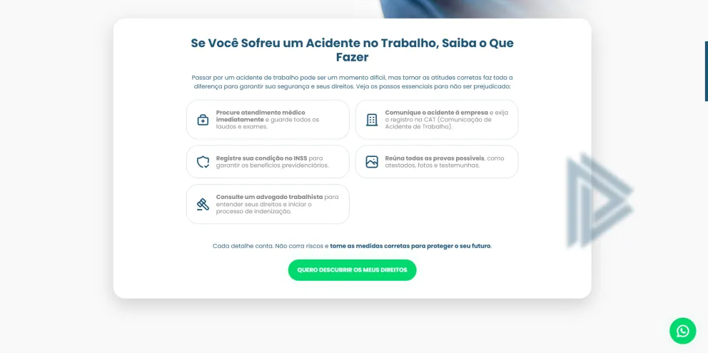 A DCastro Advogados Trabalhistas é um escritório especializado em Direito Trabalhista, com sede em Recife, Pernambuco, e mais de 14 anos de experiência. Atende clientes de todo o Brasil por meio de consultas online, oferecendo serviços como defesa dos direitos trabalhistas, orientação sobre acidentes de trabalho e ações judiciais relacionadas. A equipe é composta por advogados especializados, comprometidos com a ética e a celeridade no atendimento.