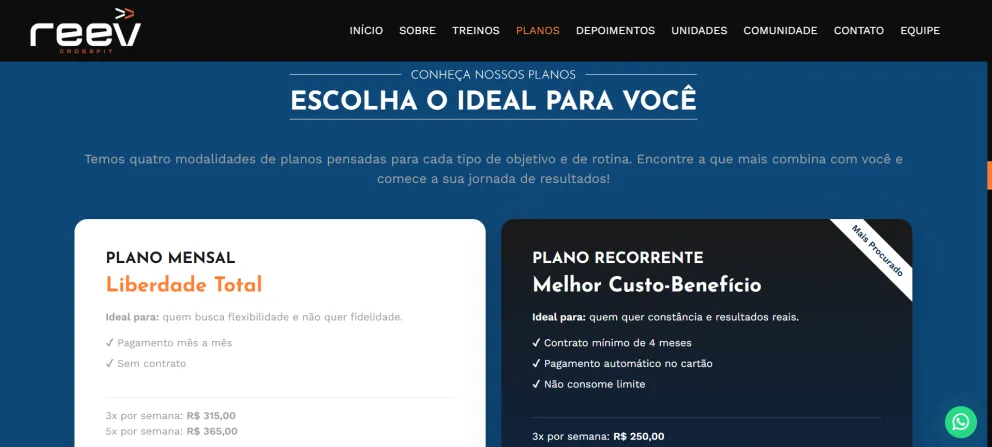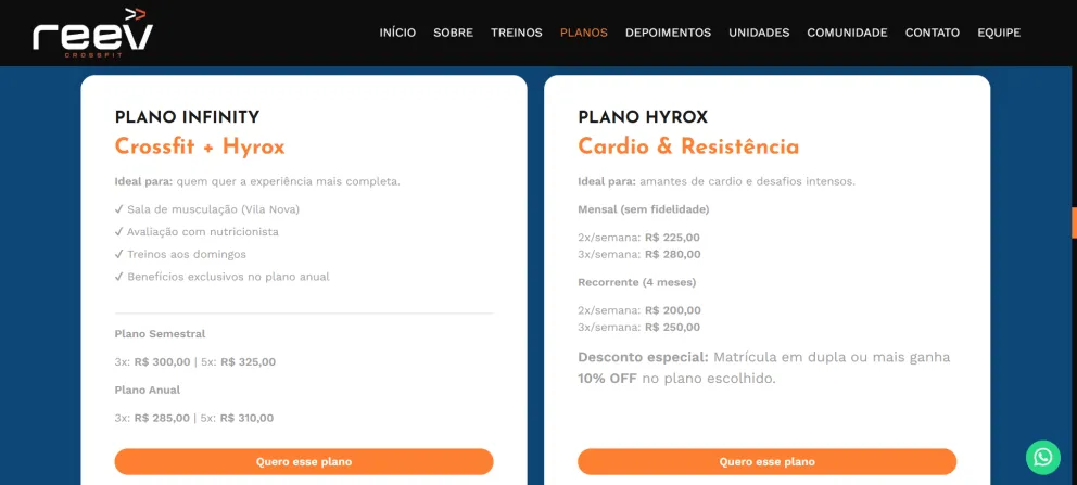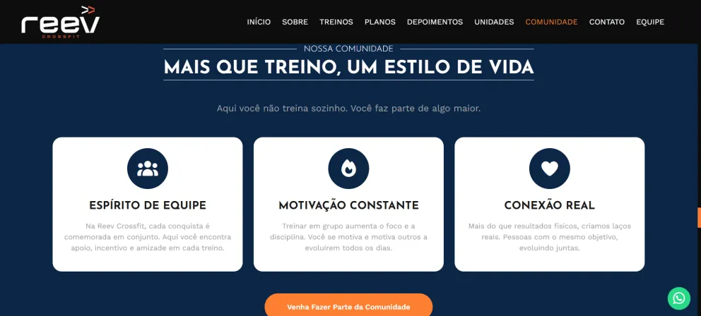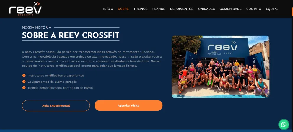 Reev Crossfit é uma academia/box de Crossfit que tem como foco treinos funcionais de alta intensidade voltados para transformação física e mental. A proposta principal da Reev é proporcionar condicionamento físico completo e ajudar seus praticantes a alcançarem metas de força, resistência, flexibilidade e bem-estar através de metodologias modernas de treino.